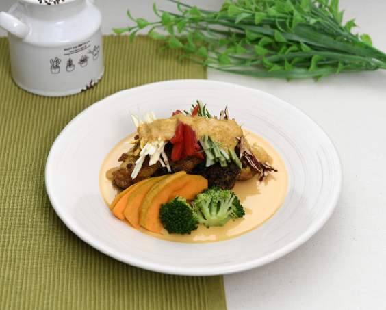 - 6. 팬에 기름을 두르고 5번을 올려 은근히 익혀 접시에 담고, 썰어 놓은 야채를 닭살위에 담은 뒤 디종머스터드를 올린다.