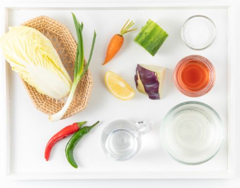 배추 10g, 콜라비 5g, 오이 2g, 당근 2g, 실파 1g, 청,홍고추 1g, 레몬 5g, 오미자엑기스 5g, 식초 30g, 설탕 5g, 물 10ml