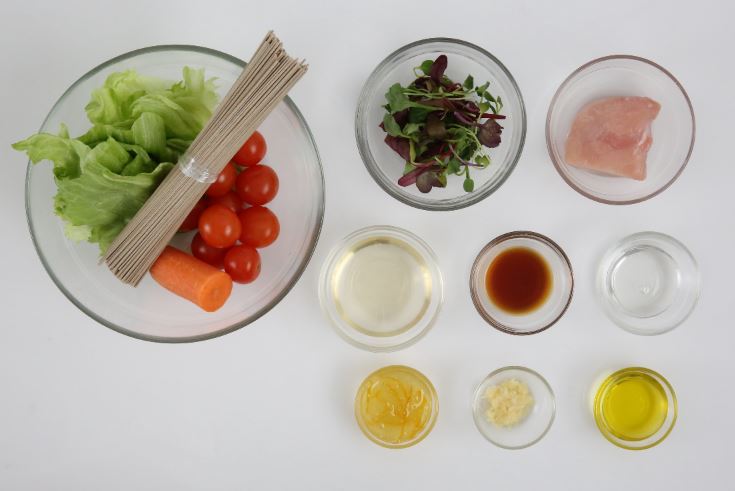 양상추(40g), 당근(10g), 방울토마토(30g), 닭가슴살(60g), 메밀면(90g), 어린잎채소(10g), 식초(20g), 간장(15g), 올리브유(15g), 다진 마늘(3g), 올리고당(5g), 유자청(10g)