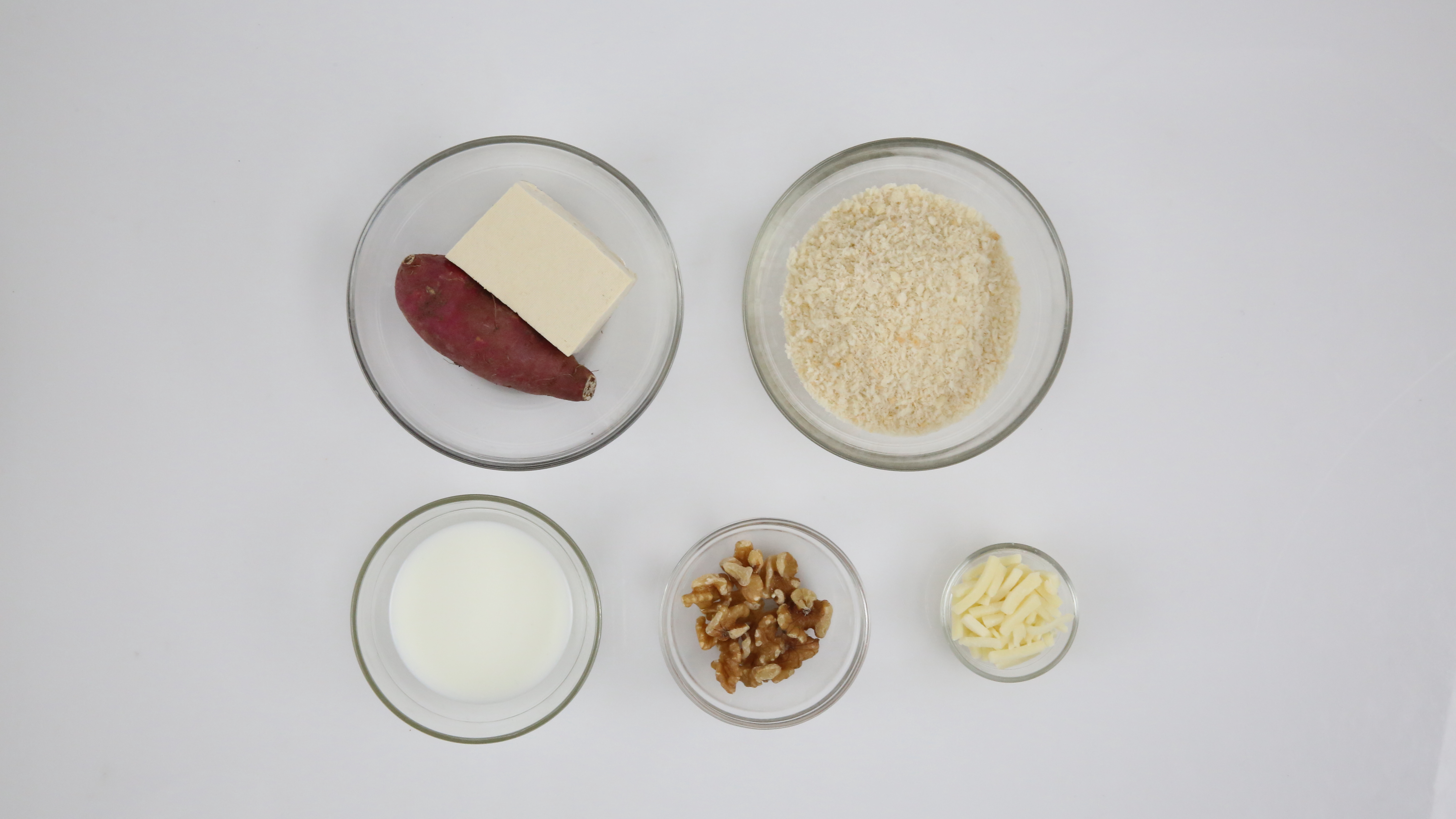 고구마(50g), 호두(15g), 우유(10㎖), 두부(150g), 빵가루(50g), 모차렐라치즈(15g), 식용유(100ml)