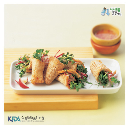 돼지고기 등심 50g, 젖은 찹쌀가루 50g [소스소개] 밑간양념:간장 1g, 물엿 3g, 다진마늘 2g, 후춧가루 0.1g, 무순 1g, 레디쉬 0.3g, 깻잎 1.5g, 대파 3g 저나트륨된장소스:된장 1g, 파인애플 15g, 물 30g, 홍고추 0.5g, 통마늘 0.3g
