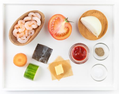 새우살 30g, 토마토 20g, 양파 15g, 당근 10g, 애호박 15g, 건다시마 3g, 버터 3g, 케찹 5g,10g, 후추 0.1g, 소금 0.2g, 물 300ml