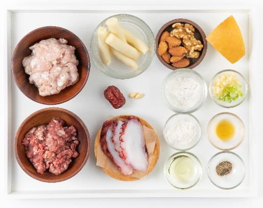돈민찌 80g, 우민찌 30g, 떡 40g, 문어 3g, 배 5g, 호두 3g, 아몬드 3g, 다진마늘 5g, 다진파 5g, 찹쌀가루 5g, 참기름 1g, 후추 1g, 밀가루 0.5g, 식용유 5g, 대추 2g, 잣 2g