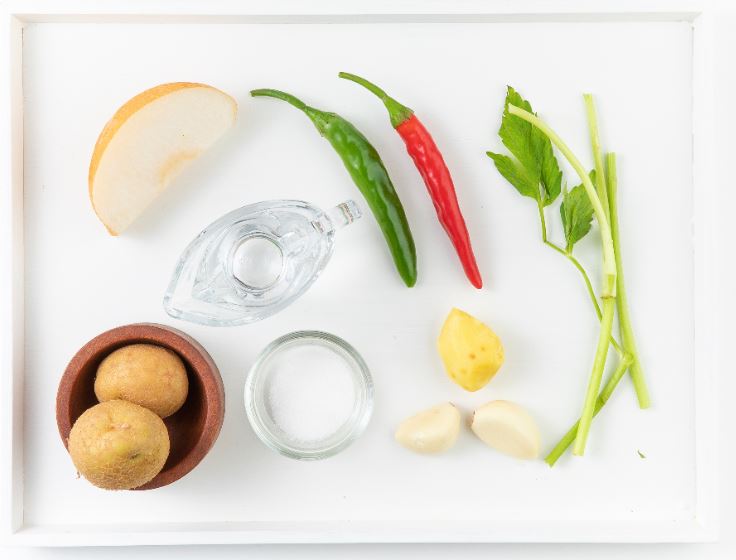 배 30g, 미나리 1g, 청홍고추 0.2g, 감자 4g, 설탕 3g, 마늘 2g, 생강 1g, 물 100ml