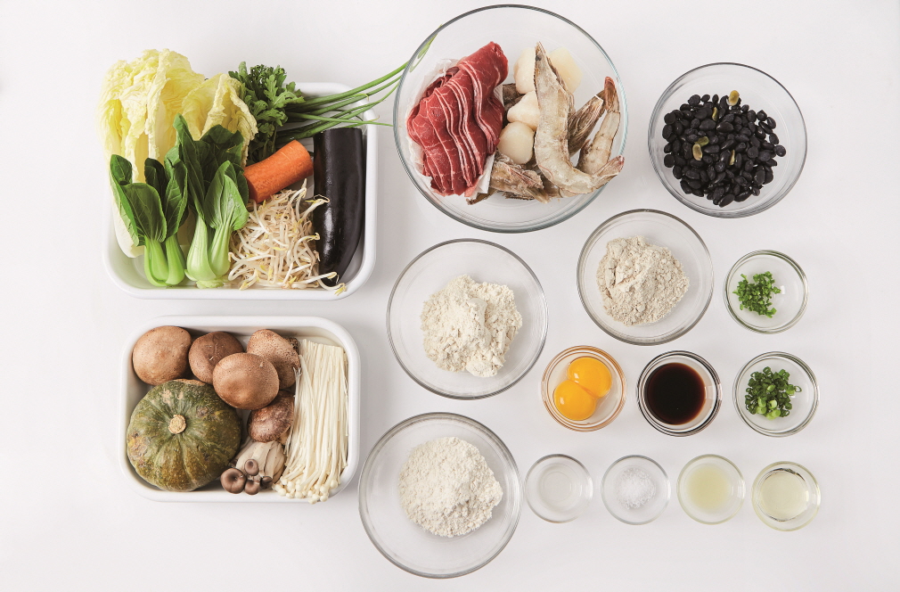 [ 2인분 ] 팽이버섯(½봉), 느타리버섯(½줌), 알배추(½개), 쪽파(3대), 가지(½개), 당근(¼개), 흰다리새우(7마리), 관자(4개), 삶은 검은콩(½컵), 소고기(불고기용 부채살, 200g), 숙주(⅓줌), 달걀노른자(2개), 쑥갓(⅓줌), 미니 단호박(½개), 생표고버섯(5개), 청경채(2개), 소금(0.3Ts), 통밀가루(¼컵), 돼지감자가루(¼컵), 현미쌀가루(¼컵), 저염 간장(2Ts), 맛술(0.3Ts), 꿀(1Ts), 레몬즙(1Ts), 다진 쪽파(1Ts), 다진 청양고추(0.5Ts)