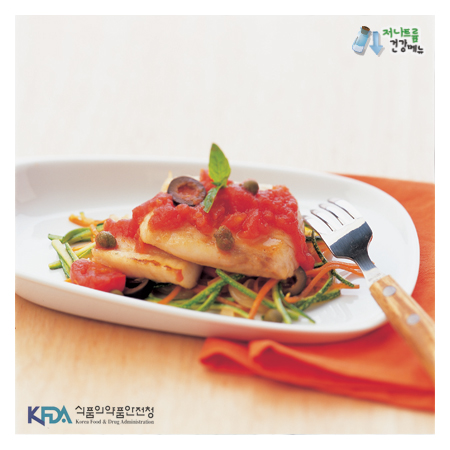 도미 100g, 후춧가루 0.1g, 밀가루 4g, 식용유 12g, 화이트와인 50g, 물 50g, 파슬리다진것 1g[소스소개] 지중해소스:토마토 20g, 올리브 10g, 케이퍼 3g, 양파다진것 5g, 마늘다진것 2g, 토마토 15g, 바질 3g