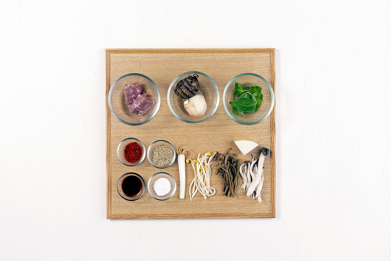 소고기(양지) 3g, 무 20g, 알토란 30g, 대파 15g, 느타리버섯 10g, 고사리 10g, 콩나물 10g, 고춧가루 10g, 깻잎순 3g, 들깨가루 15g, 소금 3g, 간장 3g