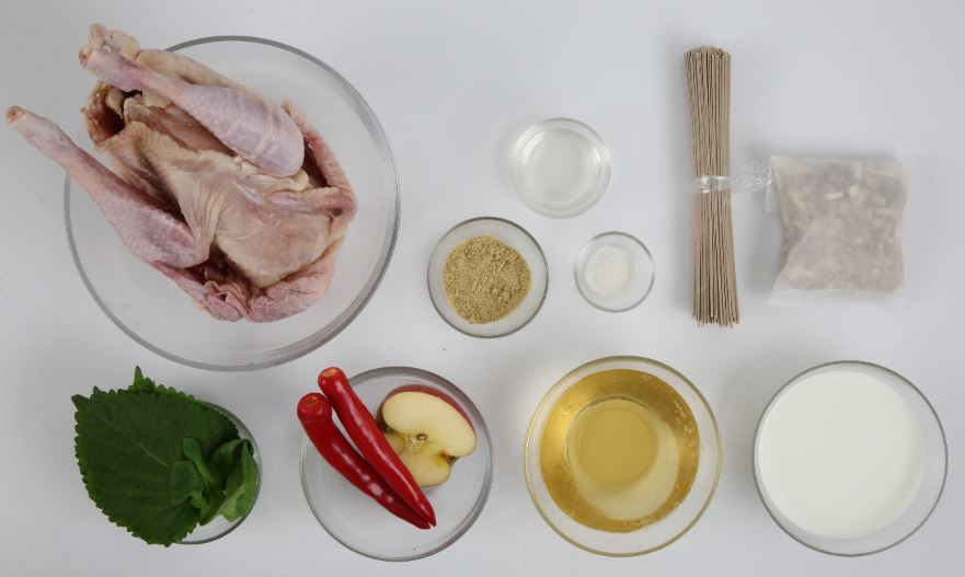 삼계탕용 닭(250g), 우유(500㎖), 삼계탕 티백(70g), 메밀면(100g), 깻잎(5장), 바질(5장), 삼계탕 육수(100㎖), 사과식초(30g), 홍고추(2개), 사과(½개), 삼계탕 육수(30㎖), 들깻가루(20g), 소금(2g)