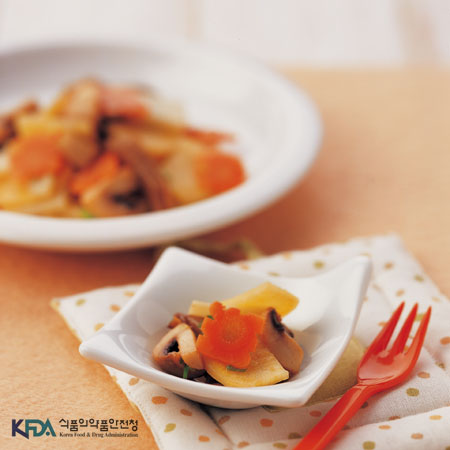 감자 20g, 양송이버섯 15g, 당근 15g, 건목이버섯 5g, 산마 10g, 참기름 1g, 물전분 6g, 육수 6g, 식용유 2g, 소금적당량
