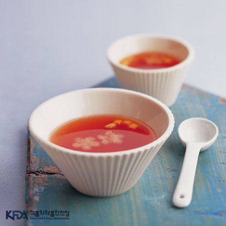 오미자 5g, 천도복숭아 30g, 배 10g, 설탕 10g, 물 45g, 잣 1g 설탕시럼 설탕과 물을 동량으로 하여 중불에서 서서히 녹인다. 기호에 맞게 만든다.