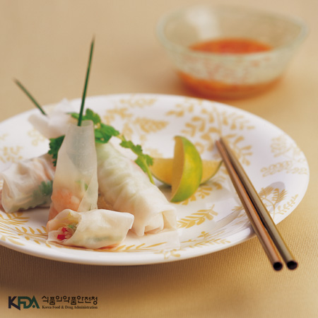 새우 20g, 홍피망 5g, 팽이버섯 5g, 숙주 15g, 무순 3g, 상추 5g, 차이브 5g, 쌀국수가는것 15g, 라이스페이퍼 20g[새콤 달콤 소스] 양파 5g, 마늘 1g, 홍고추 1g, 청고추 1g, 물전분 약간, 물 약간, 식초 3g, 설탕 1g, 고추기름 약간