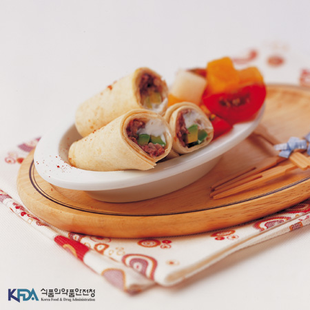 양파 10g, 할라피뇨 3g, 쇠고기갈은것 10g, 토마토콩카세 10g, 양상추 10g, 올리브오일 1g, 또띠아8인치 30g, 아보카도 6g, 사워크림 3g, 소금적당량, 후춧가루 적당량[강낭콩 퓨레]강낭콩 40g, 베이컨 2g, 마늘 1g, 양파 10g, 바질마른것 약간 [살사] 배 3g, 오렌지 3g, 레몬주스 2g, 파프리카 가루 1g