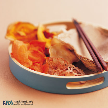 - 6. 구워진 야채칩을 식혀 담는다.본 저작물은 '식품의약품안전처'에서 작성하여 개방한 '조리식품의 레시피 DB'을 이용하였으며,