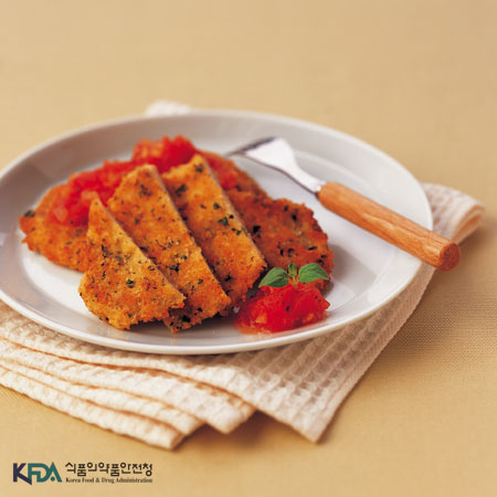 - 4. 고기에 밀가루, 달걀물, 허브 빵가루 순으로 묻힌다.