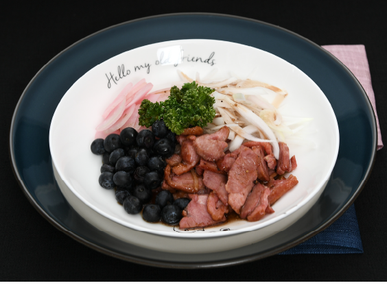 오리고기(훈제오리 가슴살, 150g), 발사믹소스(50g), 양파(30g), 파슬리(5g), 블루베리(20g), 레디쉬(1개)
