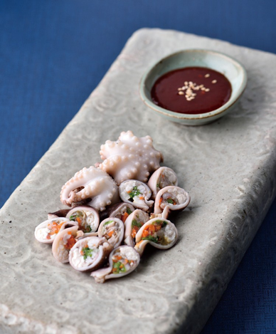 주꾸미 200g, 미나리 20g, 양파 25g, 당근 20g, 계란 60g 다진마늘 15g, 생강청 15g, 레몬즙 10g 소스 : 고추장 15g, 레몬즙 10g, 생강청 10g, 통깨 3g