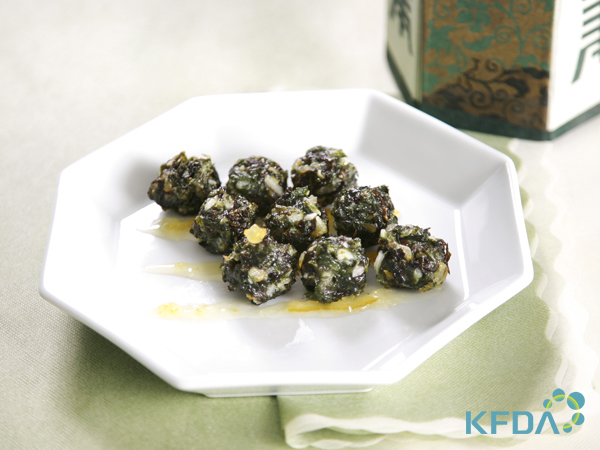 불린 미역(혹은 물미역) 7, 파래(생것) 10, 김 1.3, 양파 7, 유자청 15, 물 20, 다진 파 4, 다진 마늘 1, 감자전분 10, 계란 7, 콩기름 4