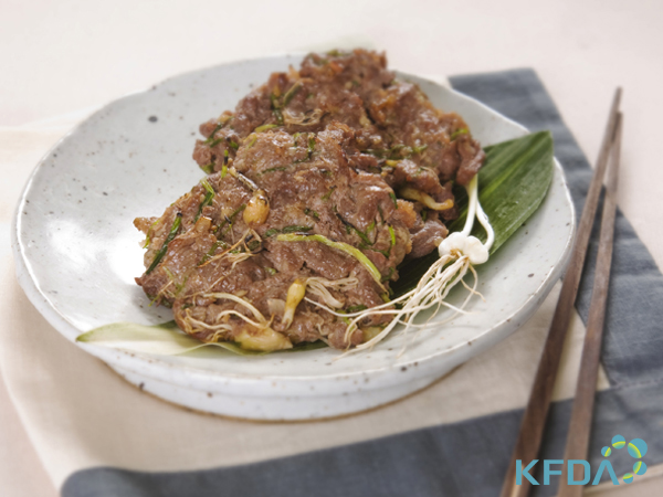 주재료: 쇠고기등심 60, 달래 5, 올리브유 5 양념장: 간장 4, 설탕 3, 다진 양파 15, 다진 마늘 2, 후추 0.01