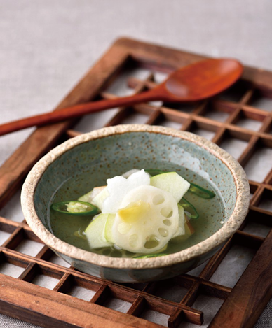 무 50g, 연근 25g, 사과 25g, 배 30g, 함초소금 2g 국물 : 매실청 30g, 생강청 15g, 함초소금 1g, 청양고추 10g