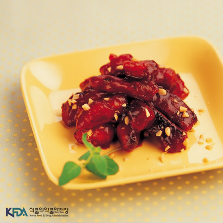 고등어 35g, 전분 5g, 땅콩 1g, 튀김기름 5g [고등어 밑 양념]생강즙 1g, 청주 2g, 소금적당량, 후춧가루 적당량[조림장]간장 1g, 고추장 3g, 토마토케첩 3g, 설탕 1g, 물엿 3g, 물 5g