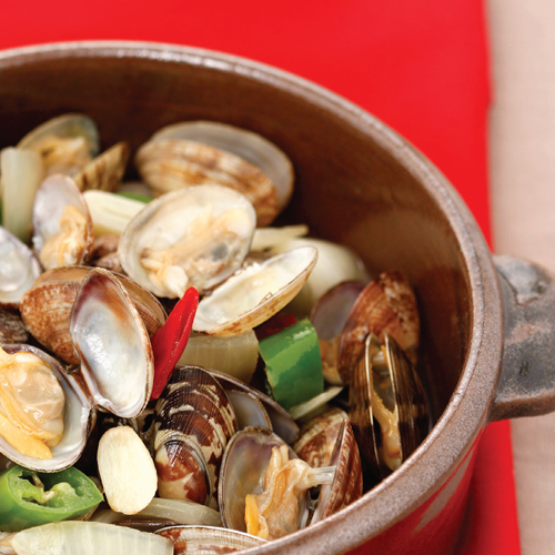 - 4. 달궈진 팬에 올리브오일을 두르고 마늘, 마른홍고추, 양파를 넣어 볶아 향을 낸 후, 센불로 불을 키우고 모시조개를 넣는다.