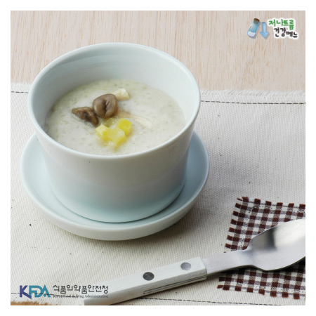 고구마 20g, 양송이버섯 15g, 양파 10g, 느타리버섯 7g, 현미(불린것) 30g, 저지방우유 130g, 식용유 20g, 물 100g