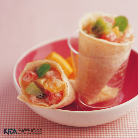 자몽 30g, 오렌지 30g, 키위 30g, 사과 30g, 플레인 요구르트 30g, 꿀 5g, 또띠아 45g