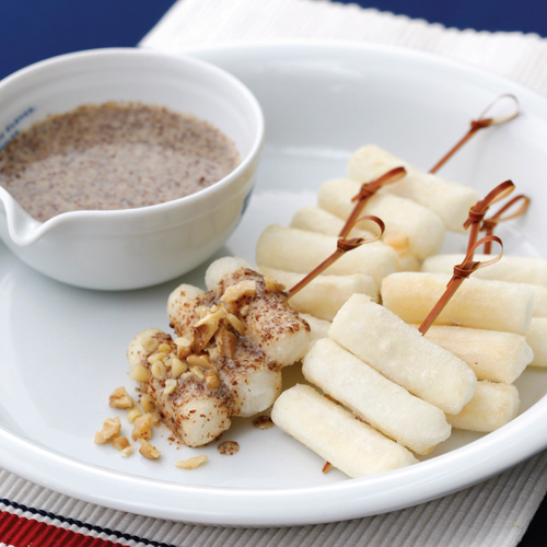 ●떡꼬치: 쌀떡 90g, ghen 10g(1알), 잣 5g(5알), 식용유 30g(2큰술), 꼬치용 꼬치 6개 ●레몬 들깨 소스: 들깨가루 45g(3큰술), 두유 45g(3큰술), 꿀 15g(1큰술), 물 15ml(1큰술), 참기름 7g(1작은술), 레몬즙 7g(1작은술), 검은깨 5g(1작은술)