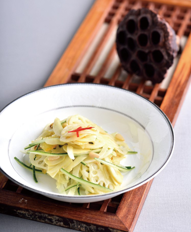 연근 200g, 양파 60g, 오이 40g, 밤 60g 소스 : 유자청 25g, 강황가루 2g, 잣 2g, 설탕 5g, 식초 15g
