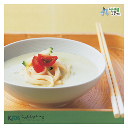 - 6. 그릇에 국수를 담고 잣, 콩물을 부은 후 채썬 오이와 반 가른 체리토마토를 얹고 흑임자를 뿌려 완성한다.본 저작물은 '식품의약품안전처'에서 작성하여 개방한 '조리식품의 레시피 DB'을 이용하였으며,