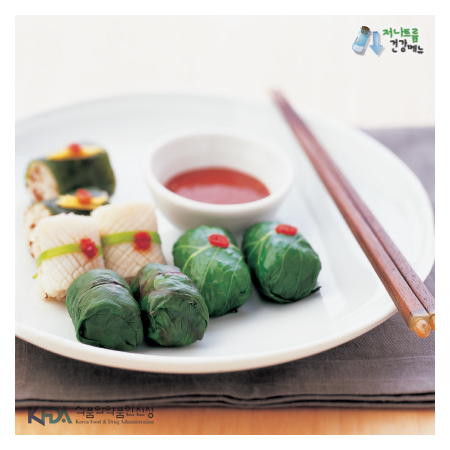 밥 140g, 쇠고기다진것 15g, 후춧가루 0.01g, 참기름 2g, 근대 20g, 쌈다시마 15g, 양배추 20g, 케일20g, 앤다이브 20g, 깻잎 10g, 미나리 1g, 오징어 10g [소스 소개] 저나트륨 양념간장:간장 6g, 물 30g, 홍고추 3g, 청고주 2g
