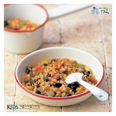 쇠고기갈은것 50g, 서리태 30g, 셀러리 3g, 양파 7.5g, 청피망 4.5g, 토마토 61.5g, 베이컨 4.5g, 현미 30g, 닭육수 30g, 물 40.5g, 마늘다진것 0.8g, 월계수잎마른것 0.2g, 타임마른것 0.3g, 후춧가루 0.2g, 카엔페퍼 0.2g