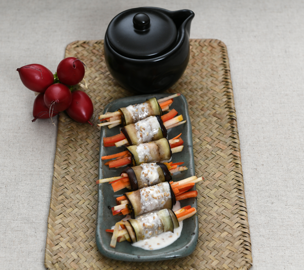 - 5. 구운 가지에 단호박을 얇게 바르고 야채들을 넣고 돌돌 만다.