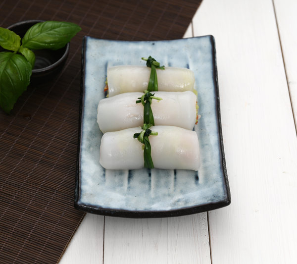 - 4. 곤약을 깔고 백김치, 오징어, 파프리카를 얹어 말아준다.