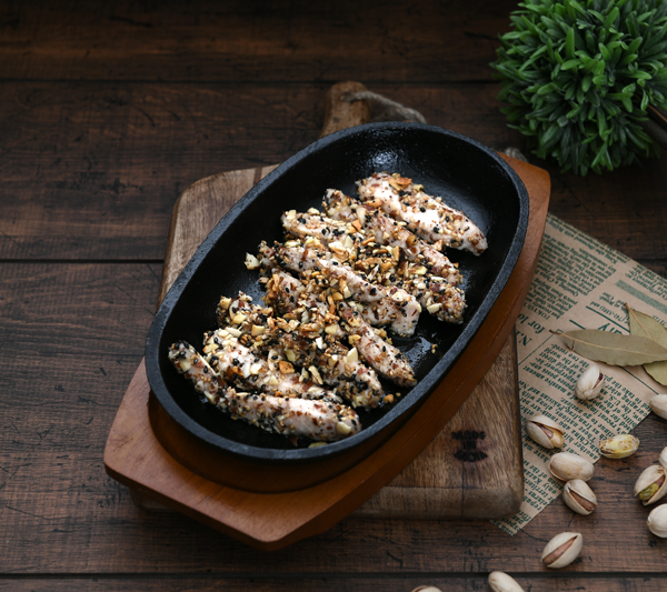 닭고기(가슴살, 25g), 우유(10g), 아몬드슬라이스(10g), 참깨(2g), 흑임자(1g), 소금(0.1g), 후춧가루(0.1g)