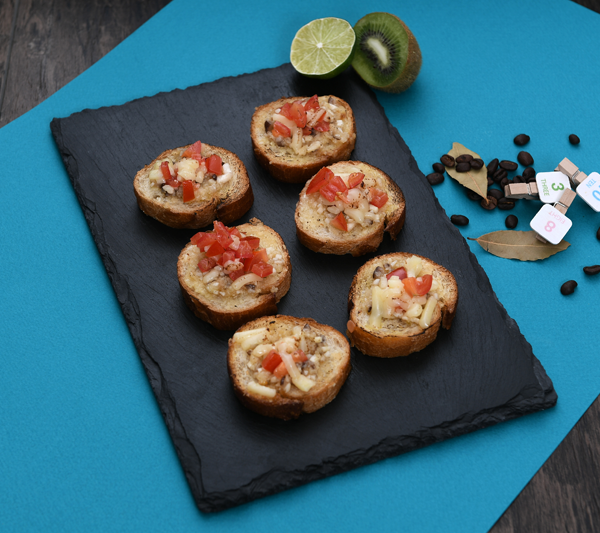 바게트(1/4개), 새송이버섯(15g), 표고버섯(10g), 방울토마토(2개), 바질(10g), 생모짜렐라치즈(15g), 마늘(2.5g), 올리브오일(10g), 소금(0.2g)