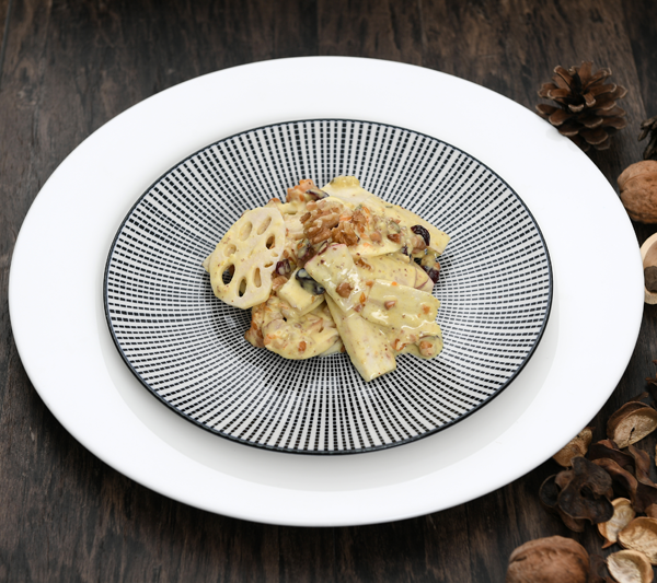 - 5. 연근, 우엉, 레디쉬, 오렌지, 땅콩, 호두를 만들어둔 소스와 함께 버무린다.