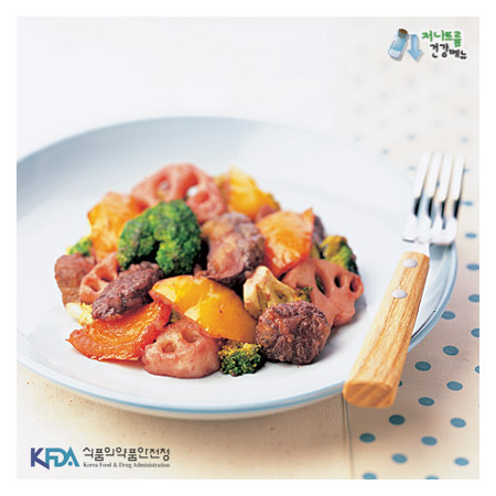 표고버섯마른것 20g, 연근 20g, 주황파프리카 20g, 노랑파프리카 20g, 브로컬리 20g, 식용유 10g [소스소개] 탕수소스:감자녹말가루 7g, 레드와인 5g, 간장 2g, 식초 1g, 설탕 1g