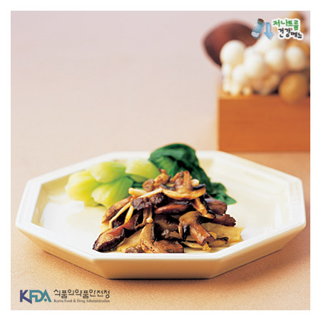 표고버섯 5g, 양송이버섯 10g, 느타리버섯 10g, 팽이버섯 5g, 새송이버섯 10g, 식용유 2g [소스소개]굴소스:굴소스 0.3g, 간장 0.3g, 마늘다진것 1g, 물 5g, 참기름 0.6g, 부추 또는 실파 10g