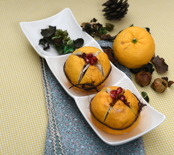 - 4. 속을 빼낸 유자에 소를 2/3쯤 채워 입구를 실로 묶는다.