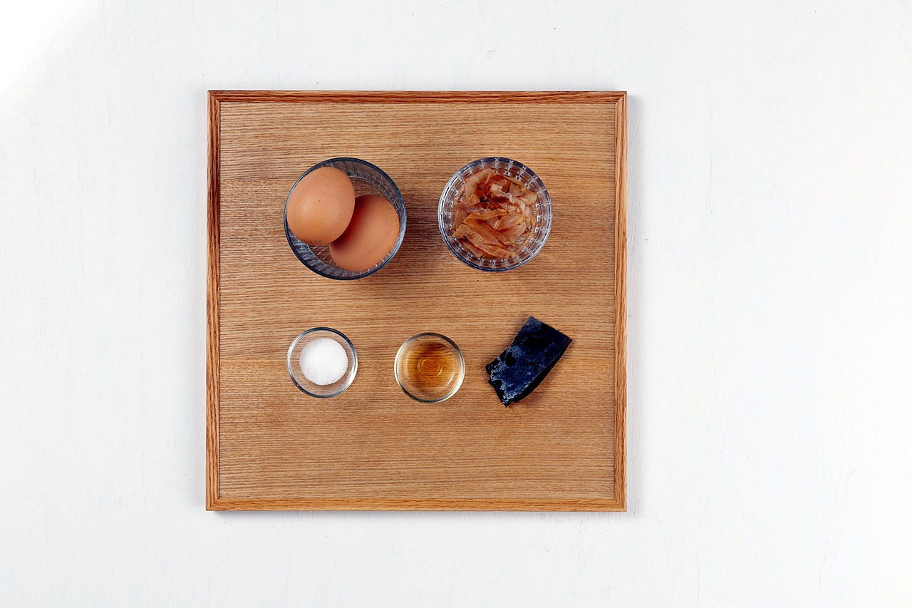 계란 150g, 가츠오부시 10g, 다시마 10g, 설탕 5g, 미림 5g