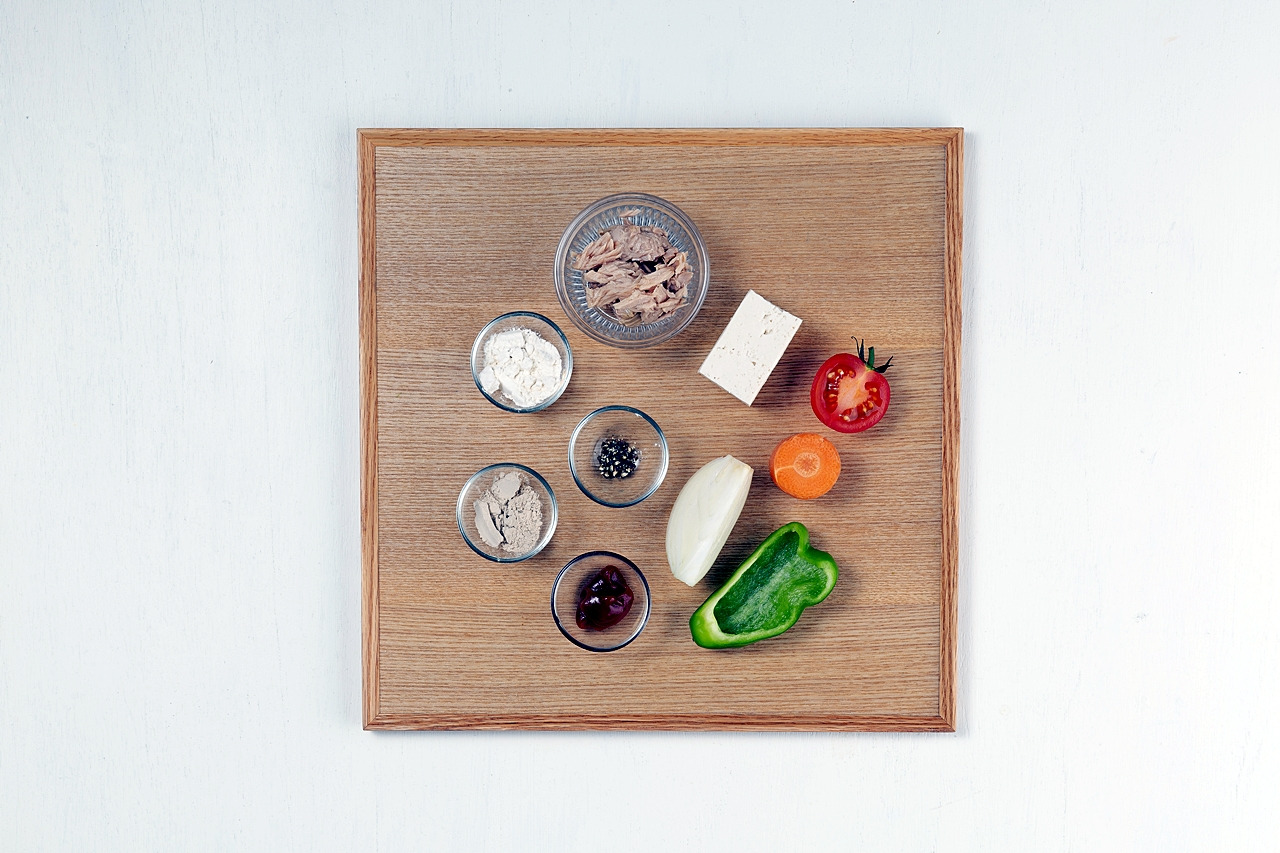 캔참치 20g, 두부 20g, 양파 25g, 토마토 15g, 청피망 20g, 당근 10g, 밀가루 7g, 케찹 15g, 표고버섯가루 1g, 후추 0.5g