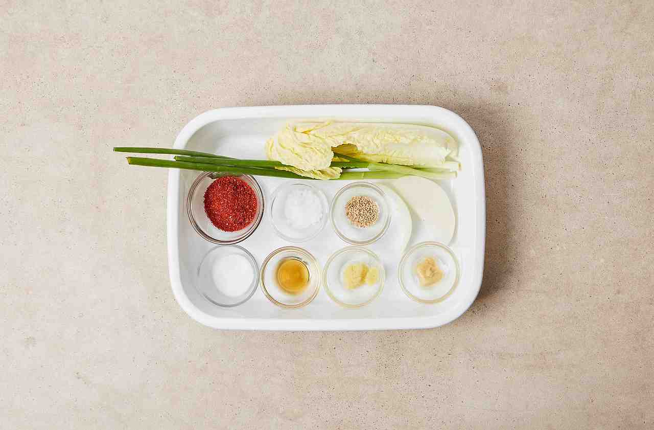 •필수재료 : 배추(50g), 무(20g), 쪽파(10g), 양파(5g), 다진마늘(5g), 다진생강(5g), 참깨(1g) •양념 : 저염소금(5g), 고춧가루(10g), 설탕(5g), 젓갈(3g)