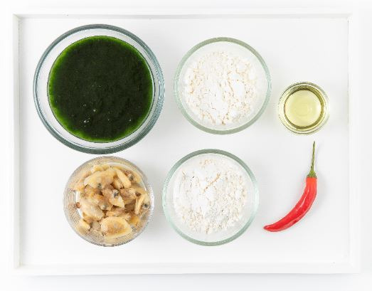 매생이 30g, 바지락살 10g, 부침가루 5g, 튀김가루 5g, 홍고추 1g, 대두유 12g