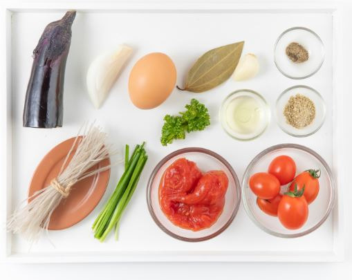 가지 7g, 당면 5g, 계란 75g(1.5개), 부추 5g, 양파 10g, 식용유 3g, 토마토홀 30g, 월계수잎 1g, 파슬리 1g, 마늘 3g, 함초소금 0.5g, 후추 0.5g