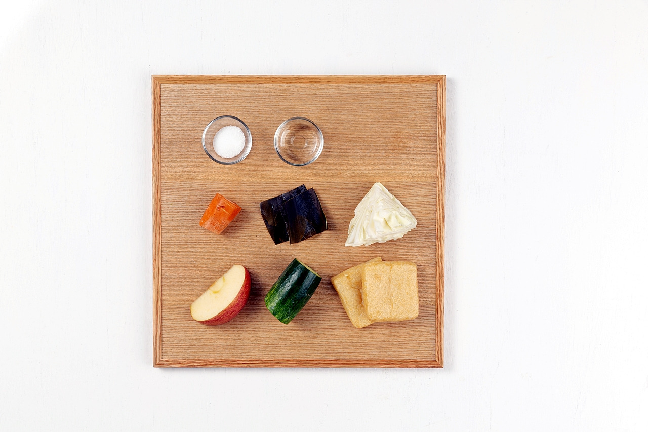 사과 20g, 유부 5g, 양배추 15g, 당근 10g, 설탕 3g, 식초 15g, 오이 15g, 다시마 5g