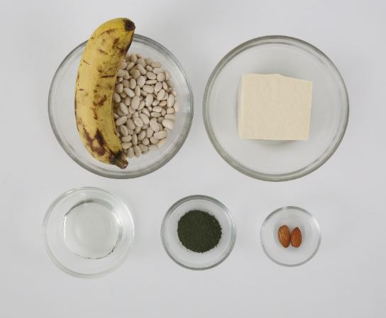 흰강낭콩(30g), 두부(140g), 우유(40g), 올리고당(50g), 바나나(1개), 쑥 파우더(1g), 아몬드(2g)