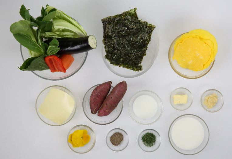 가지(½개+20g), 양배추(70g), 빨강 파프리카(20g), 당근(20g), 청경채(1단), 달걀지단(3개 분량), 구운 김(1장), 불린 라이스페이퍼(2장), 깻잎(2장), 찐 고구마(200g), 우유(15g), 무염 버터(20g), 다진 마늘(5g), 무염 치즈(15g), 생크림(75g), 후춧가루(0.5g), 식용 꽃(노란색 2개), 파슬리가루(2g), 식용유(35ml)
