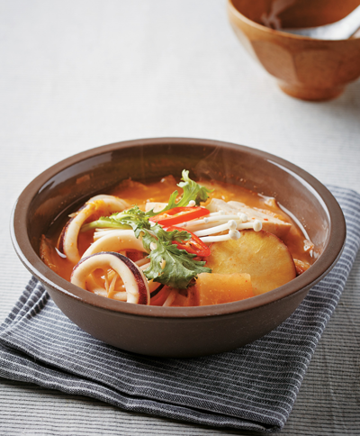 재료 오징어(100g), 두부(50g), 팽이버섯(20g), 붉은 고추(4g) 고구마(30g), 콩나물(20g), 김치(140g), 쑥갓(20g) 육수 무(50g), 다시마(5g), 대파(20g), 멸치(10g), 물(300g) 양념 참기름(10g), 들깻가루(5g)