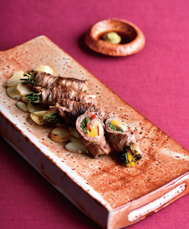- 6. 구운 마늘을 깔고 말아준 고기를 굽는다.본 저작물은 '식품의약품안전처'에서 작성하여 개방한 '조리식품의 레시피 DB'을 이용하였으며,